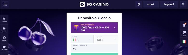 SG Casino offre un bonus di benvenuto di €100 e 50 giri gratuiti per i giocatori italiani in Austria. Questo casinò online presenta un'ampia selezione di giochi da casinò, tra cui slot, giochi da tavolo e opzioni live casino. Con diverse opzioni di pagamento, i giocatori italiani possono effettuare transazioni finanziarie in modo conveniente. La versione mobile del sito è ben ottimizzata, consentendo ai giocatori di godere dell'esperienza di gioco su dispositivi mobili ovunque si trovino. Il supporto clienti è accessibile tramite chat live e e-mail per assistenza immediata. SG Casino opera con una licenza internazionale.