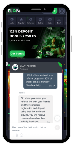 La descrizione del programma afferma che un giocatore può ricevere il 30%, ma non viene spiegato chiaramente su cosa si basa questa percentuale. Durante la compilazione di questa recensione del casinò ElonBet, ho chiesto all'assistenza cosa significasse effettivamente questo 30% - è calcolato in base ai depositi, alle scommesse o alle perdite di un amico? L'agente ha risposto: "Sì, riceverete un bonus massimo del 30% in base alla percentuale di gioco e di perdita".