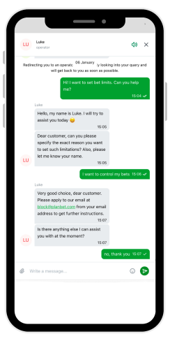 Ho contattato la chat dal vivo molte volte e non mi è piaciuto molto il suo funzionamento. La chat si connette istantaneamente e all'inizio si deve comunicare con un bot di Planbet casinò, anche se è possibile premere un pulsante per raggiungere un operatore. Gli operatori della chat dal vivo non mi sono stati di grande aiuto. Ho fatto delle domande e la prima cosa che mi hanno chiarito è stato il motivo della mia domanda. Ad esempio, ho chiesto informazioni sui limiti: il mio scopo era ovvio, ma senza spiegarlo l'operatore non ha continuato. Dopo aver fornito la mia spiegazione, gli operatori mi hanno spesso indirizzato all'assistenza via e-mail. Di conseguenza, ho trascorso del tempo in live chat quando sarebbe stato meglio scrivere subito un'e-mail.