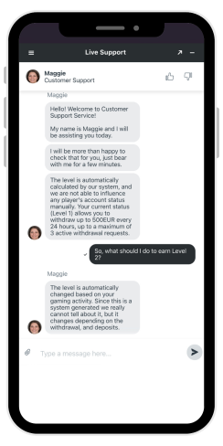 Ho anche contattato l'assistenza via e-mail. Subito dopo aver inviato un messaggio, viene inviata un'e-mail di conferma con un numero di richiesta. Nella maggior parte dei casi, una risposta completa da parte di un agente arriva entro 20 minuti, il che è veloce rispetto a molti altri casinò.