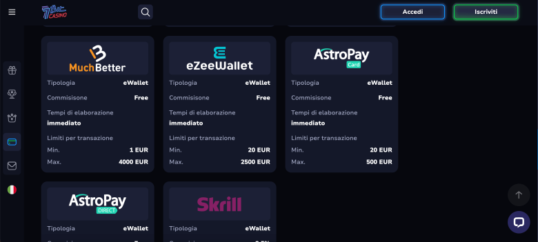 Un altro casinò italiano che merita attenzione è 7Bit. Quando si accede al sito dall'Italia, la lingua diventa automaticamente l'italiano, mostrando i bonus e i giochi disponibili per la posizione corrente. Un deposito di 1 euro vi permetterà di accedere a giochi di alto livello, tra cui esclusive come 7Bit Mega Sevens, 7Bit Million e 7Bit Bonanza. Inoltre, anche un deposito di 1 euro consente di accedere a una serie di giochi dal vivo e a titoli con jackpot progressivo come Jackpot Mines. In alternativa, è possibile depositare tramite Visa e Mastercard locali di banche come Mediobanca e Banca d'Italia. In alternativa, 7Bit Casino è favorevole alle criptovalute, compresi i Bitcoin. Le vincite attuali degli altri giocatori sono visualizzate in mBTC. Inoltre, 7Bit promuove i suoi jackpot progressivi in criptovalute.