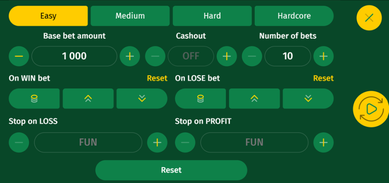 Ogni round è breve e intenso, il che lo rende ideale per i nuovi giocatori e per chi preferisce le partite veloci e il pieno controllo. È anche possibile attivare il gioco automatico. In questa modalità, si sceglie il livello di difficoltà, la dimensione della puntata, il numero di puntate e si lascia che il sistema gestisca automaticamente il gioco.