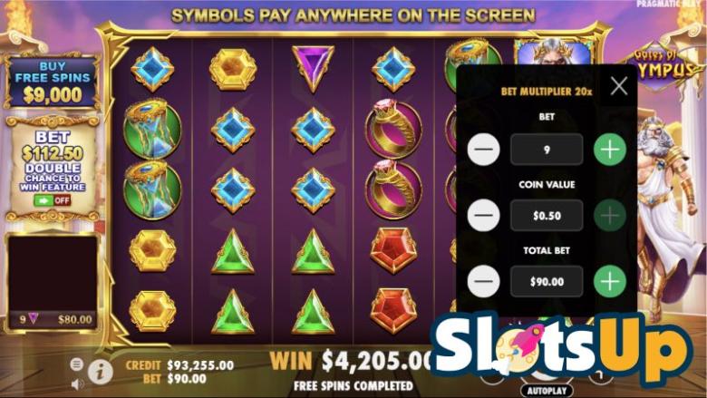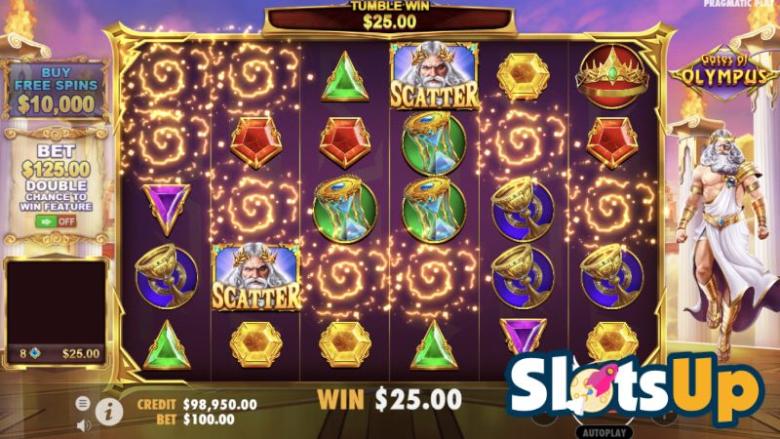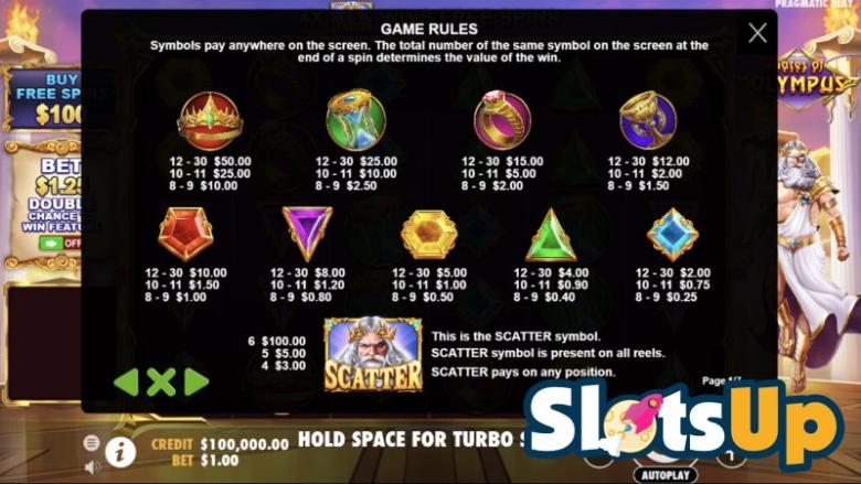 Tutti i simboli sono disegnati in stile antico. La slot machine è inoltre dotata di 5 immagini bonus. Esse sono rappresentate da 4 moltiplicatori e dallo Scatter (Zeus). Per ottenere la massima vincita è necessario collezionare da 8 a 30 immagini bonus. I simboli bonus diventano attivi dopo la comparsa di 4-6 personaggi speciali sui rulli. Per giocare alla slot Gates of Olympus gratis, il giocatore deve solo effettuare una puntata virtuale e cliccare sul pulsante di avvio. Se lo si desidera, è possibile attivare l'opzione di avvio automatico.